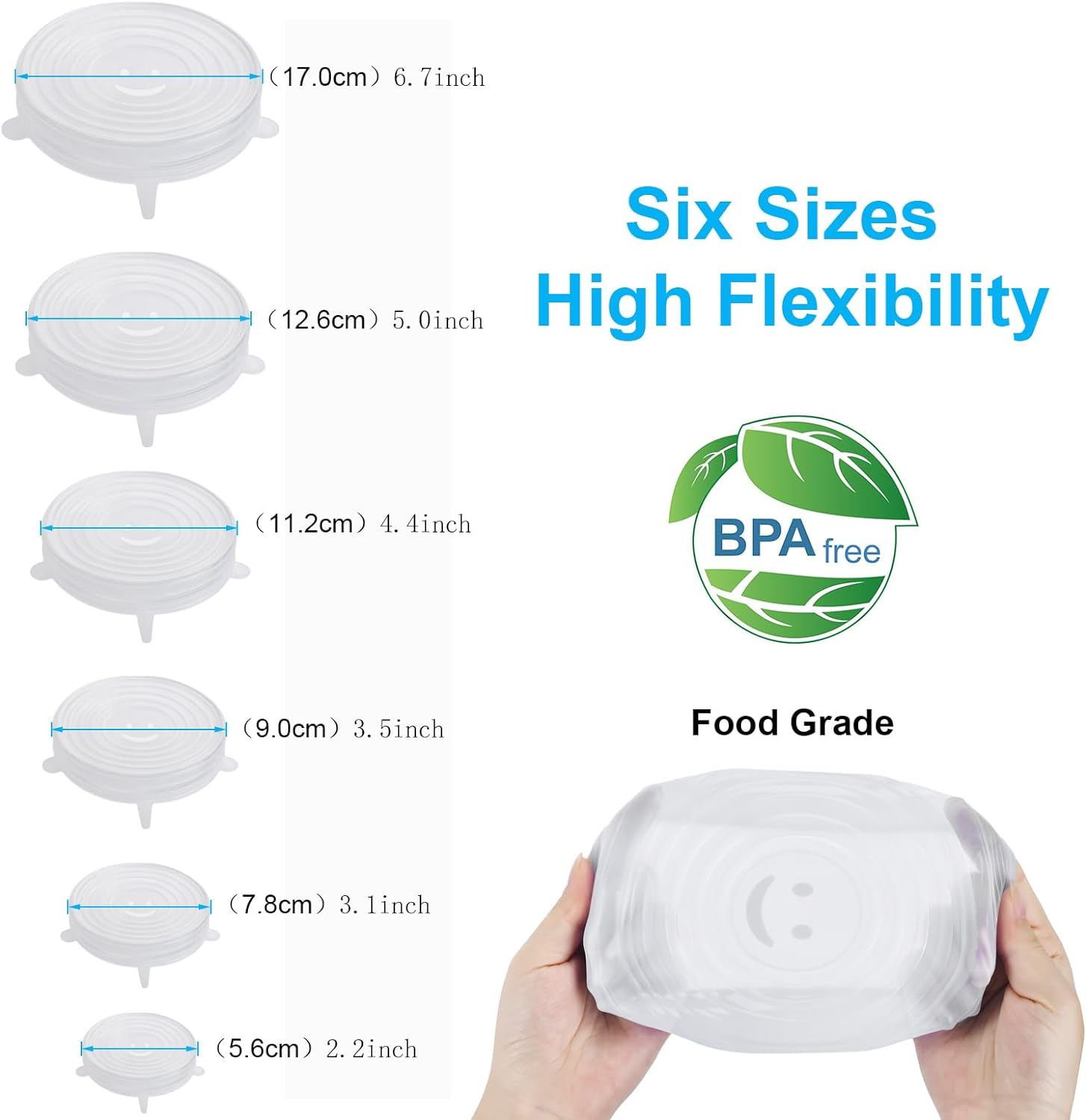 - Sellado Hermético y Flexible: Con tamaños que varían entre 2.2 y 6.7 pulgadas, estas tapas se ajustan fácilmente a diferentes recipientes, creando un sellado hermético que mantiene la frescura de tus alimentos por más tiempo.