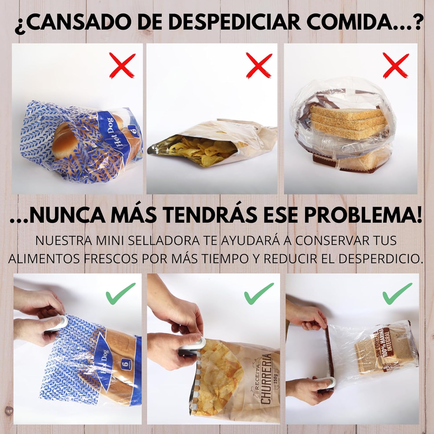 Sella Diversos Tipos de Bolsas: Perfecto para sellar bolsas de papas fritas, galletas, sándwiches, cereales y más. Ideal para bolsas de plástico y poliéster, NO apto para celofán, papel kraft o aluminio.