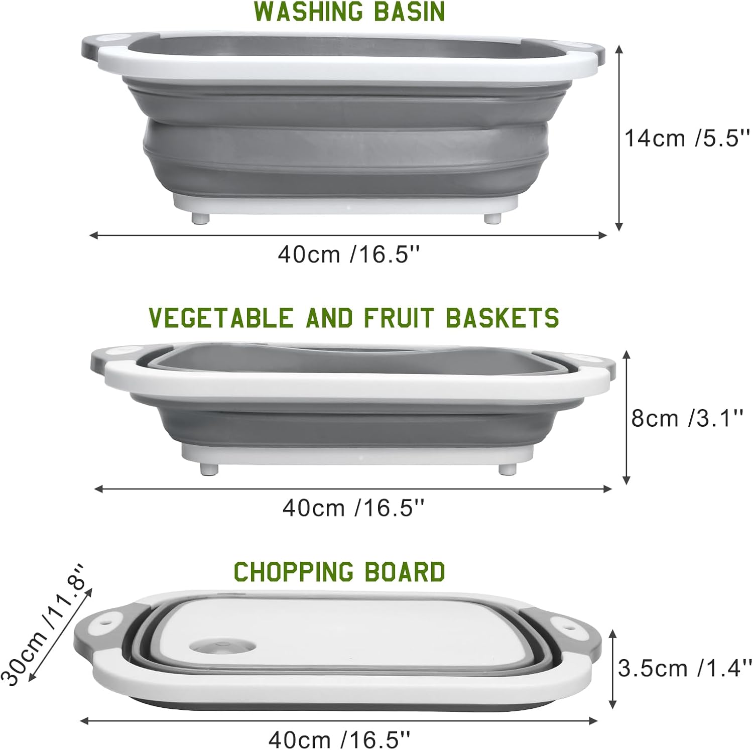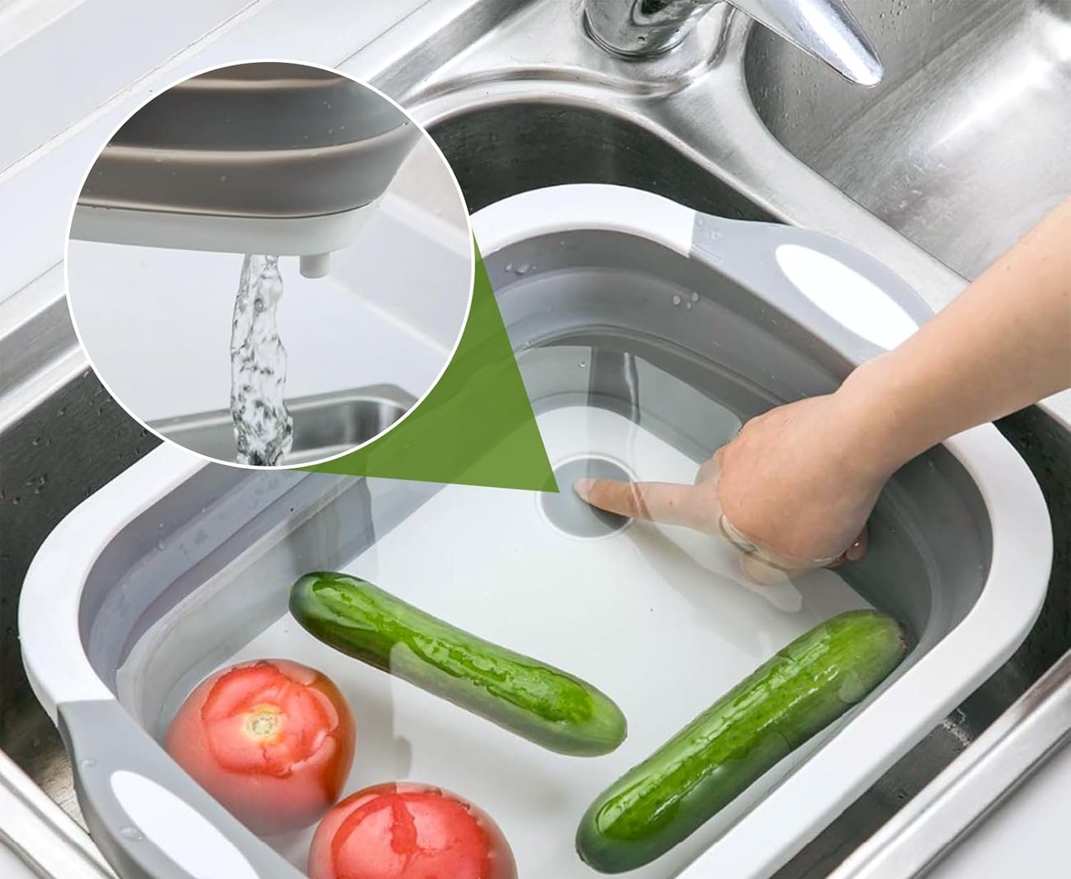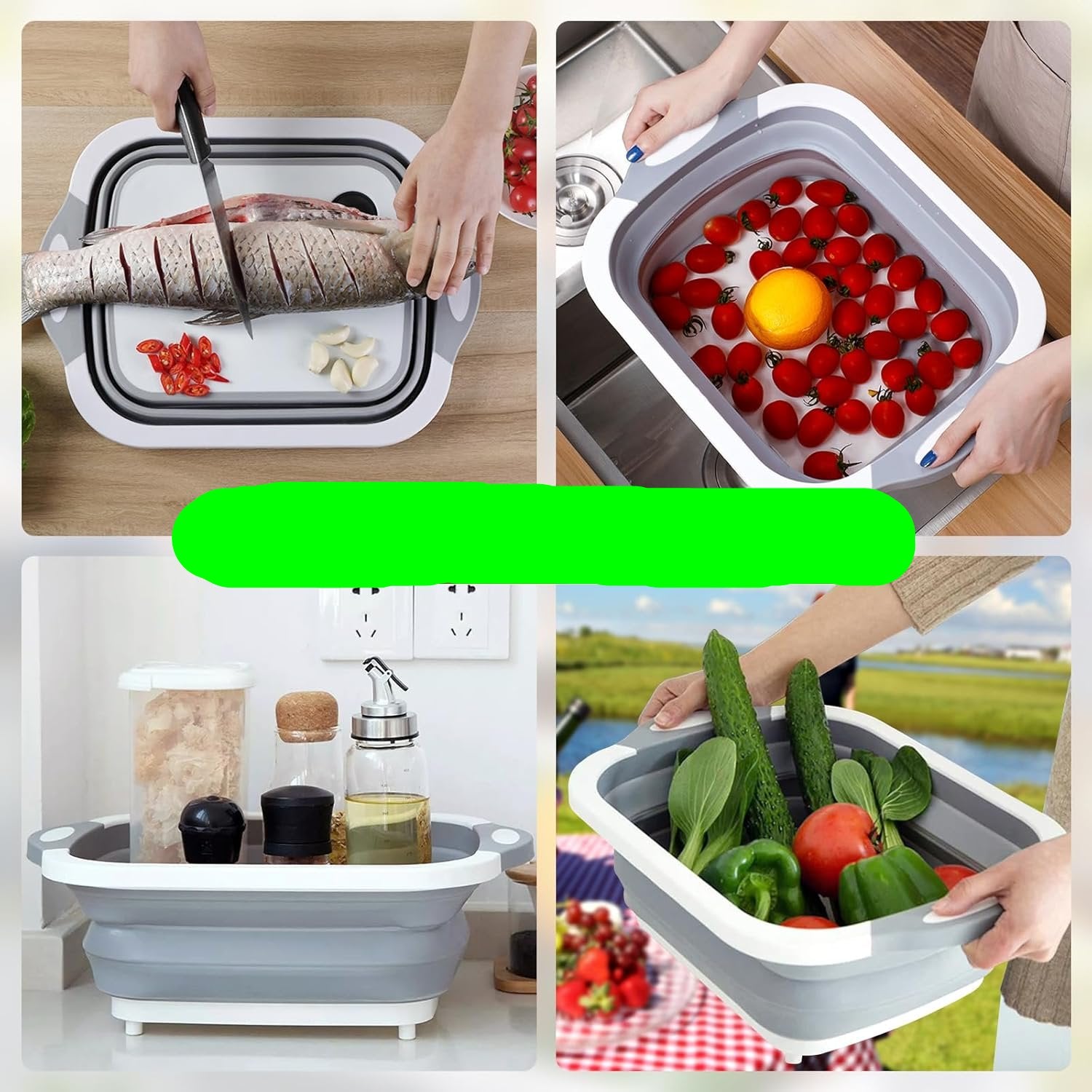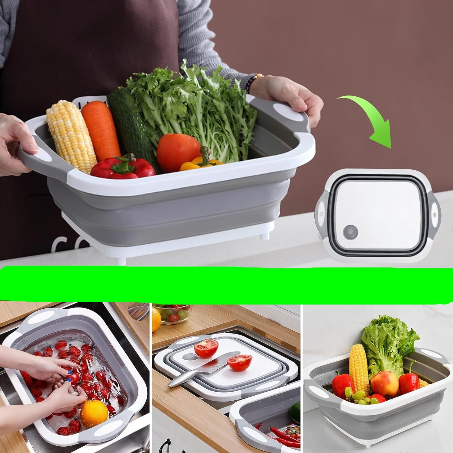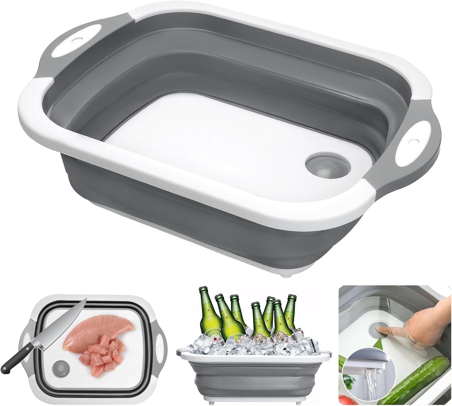 - Diseño 3 en 1 Versátil: Funciona como tabla de corte, recipiente de lavado y escurridor, brindándote una solución integral para preparar y lavar alimentos. Ideal para lavar frutas, verduras o utensilios con su filtro de drenaje circular.